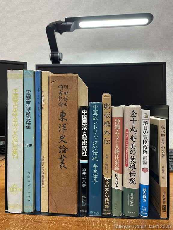 この日の収穫は以下の12冊。内モンゴル自治区発行のモンゴル史学術雑誌、中国史、奄美・沖縄史、日本史、歴史学など。