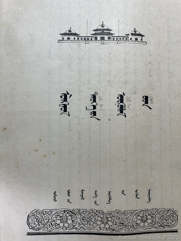 そのうちの一冊『Mongol teüke yin ögülel uud(モンゴル歴史論文集)』(下の写真)はすべてモンゴル文字モンゴル語で書かれている。